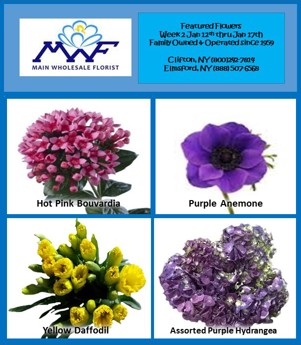 Main Wholesale Florist’s featured flowers this week include Hot Pink Bouvardia, Purple Anemone, Yellow Daffodil and Assorted Purple Hydrangea. Interested in ordering online and receiving your flowers the next day?