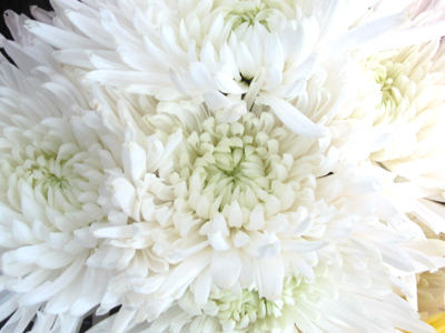 5. White Mums. Okay so this is more of a group of flowers than one flower type. Between pompon buttons, pompon cushions, cremon mums, spider anastasia, and football mums you have a wide variety of white flowers in a variety of sizes that are extremely affordable. Mums are also more stark white that other white flowers available. The stark white flowers really are perfect for patriotic arrangements.