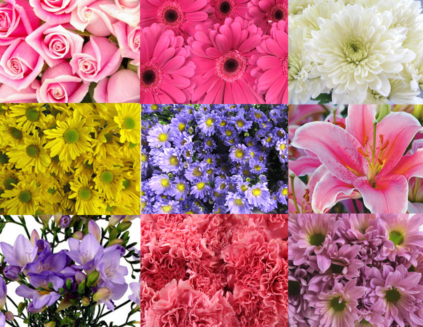 Light Pink Roses (Rosita Vendela pictured), hot pink gerbera daisies, cremon mums in all colors, yellow daisies, monte casino asters, lilies, freesia, carnations, and more!