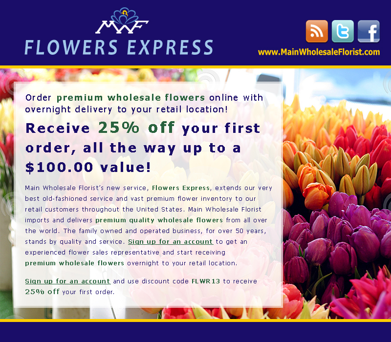 We are now offering a big discount to first time customers who place an order with MWF Flowers Express. Perfect timing for your destination weddings, summer orders, and long weekend holidays. Come sign up for an account today to get 25% off (up to 100$ value) while trying out our overnight wholesale flower shipping service.