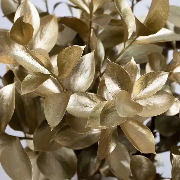 Italian Ruscus is a florist favorite. Known for its glossy leaves, stylish arching stems, and dark green foliage, ruscus adds texture to all types of arrangements. Durable and long-lasting, it holds up beautifully in various arrangements, even out of water, making it a reliable choice for event decor. Our Italian ruscus has been painted gold and silver, resembling Roman laurels.