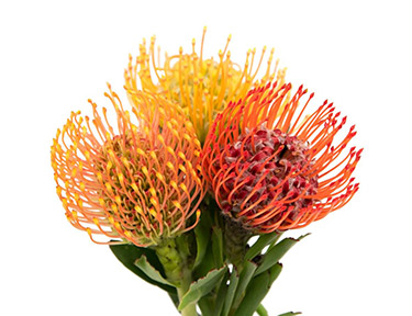 Pincushions are a unique, tropical flower available in a range of bright tones of yellow, orange and red. These colors are characteristic for this flower. The leaf is covered with a thin wax layer, which gives the flower protection for the salty sea wind that is blowing in its region of origin: South Africa. The flower is available year-round with good quality.