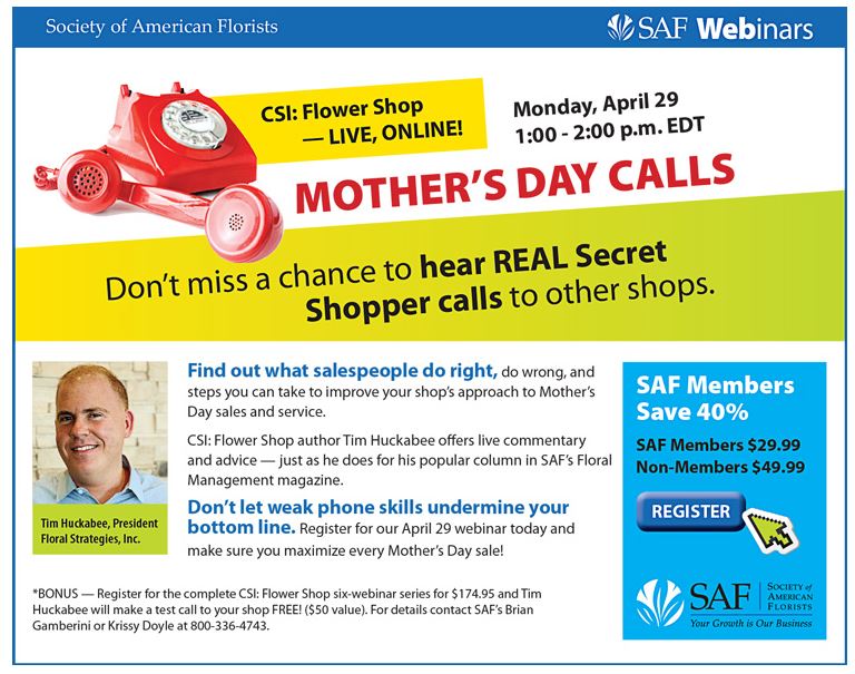 The Society of American Florists is helping retail florists with customer service techniques for Mother’s Day. They go undercover calling flower shops, recording the results, and critiquing the calls. Listen to real calls and learn what to do and what not to do when getting an order over the phone. Check out this info-graphic for some more information.